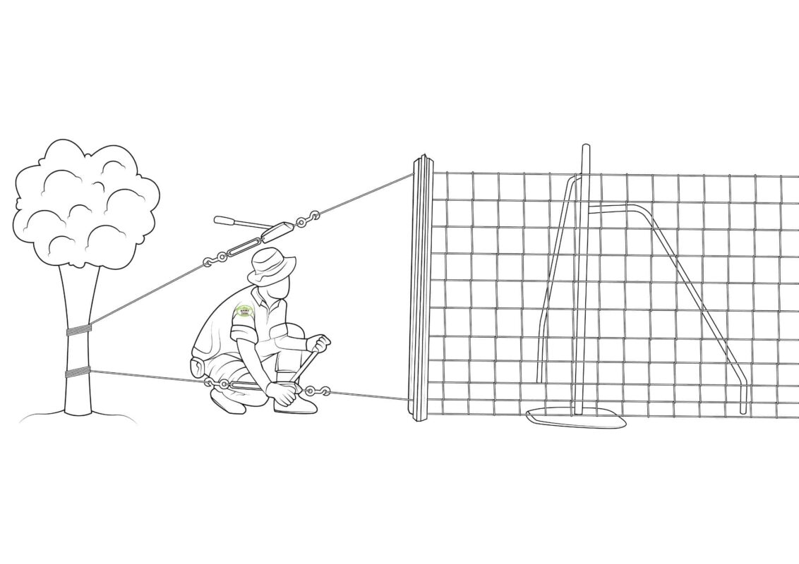 ดึงตาข่ายให้ตึง โดยใช้รอกสลิงมือโยก หรือเครื่องทุ่นแรงอื่น ๆ เป็นตัวช่วย เนื่องจากถ้าใช้แรงคน อาจจะทำให้ตาข่ายไม่ตึงเท่าที่ควร ก่อนที่จะผูกกับเสาต้นสุดท้ายให้แน่น เพื่อช่วยให้รั้วตาข่ายมีความแข็งแรงทนต่อการกระแทก และสามารถสปริงตัวได้