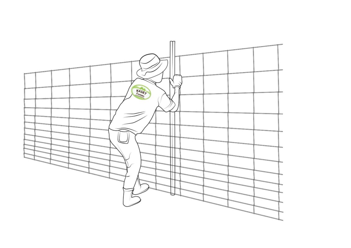 ผูกตาข่ายติดกับเสาย่อยทุกต้น โดยใช้ลวดผูกทั่วไป เป็นตัวรัดระหว่างเสากับตาข่ายให้แน่น อย่างน้อย 4 – 5 จุด/เสา