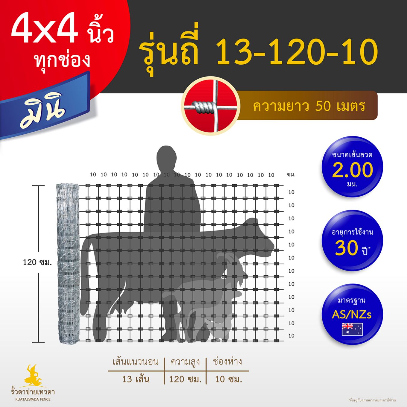 • รั้วตาข่ายถักปม รุ่นมินิ 13-120-10 ความสูง 120 เซนติเมตร ตาถี่ 4×4 นิ้ว เท่ากัน ทุกช่อง
