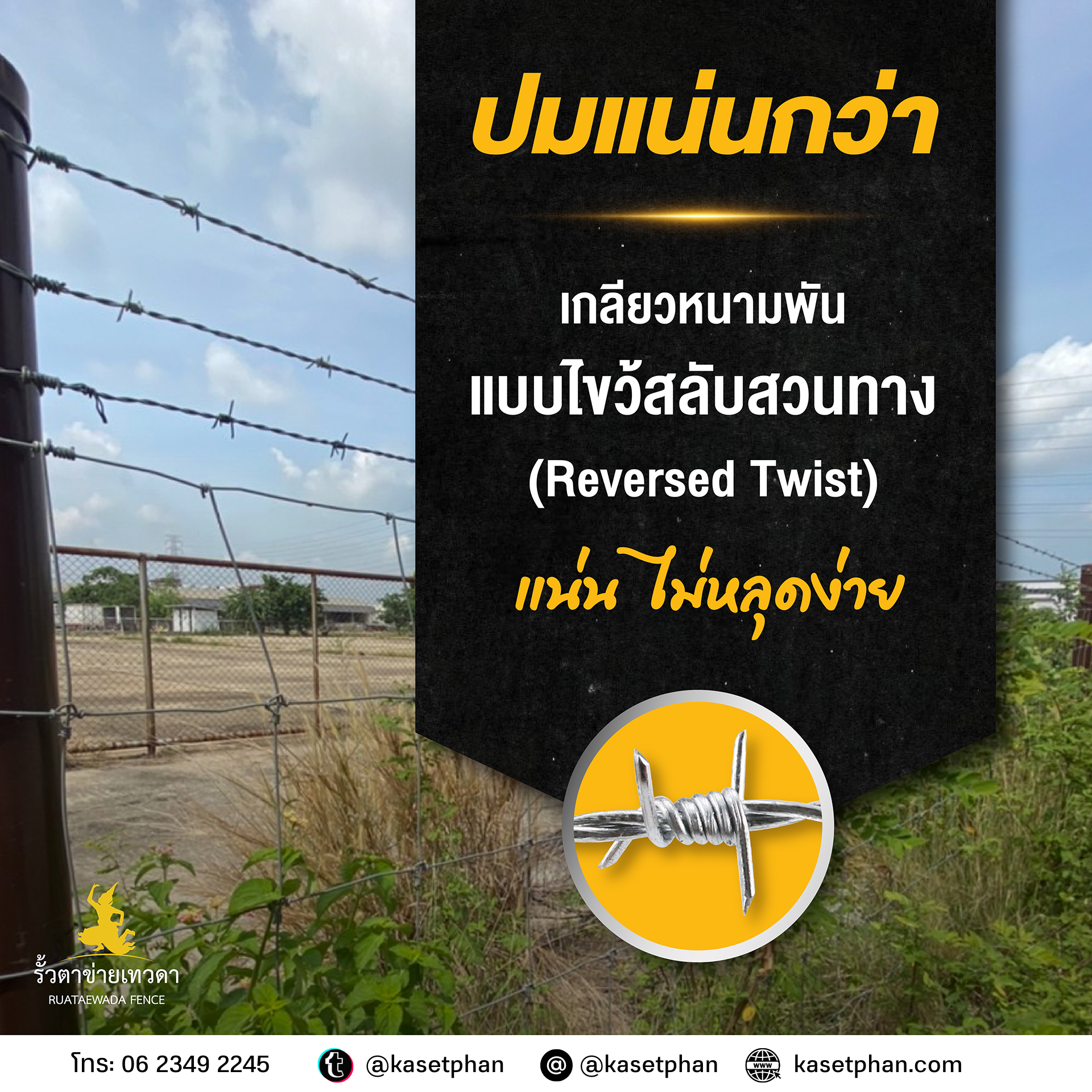 - เกลียวแน่นกว่า เกลียวหนามพันแบบไขว้สลับสวนทาง (Reversed Twist) เกลียวแน่น ไม่หลุดง่าย เหมือนลวดหนามทั่วไป
